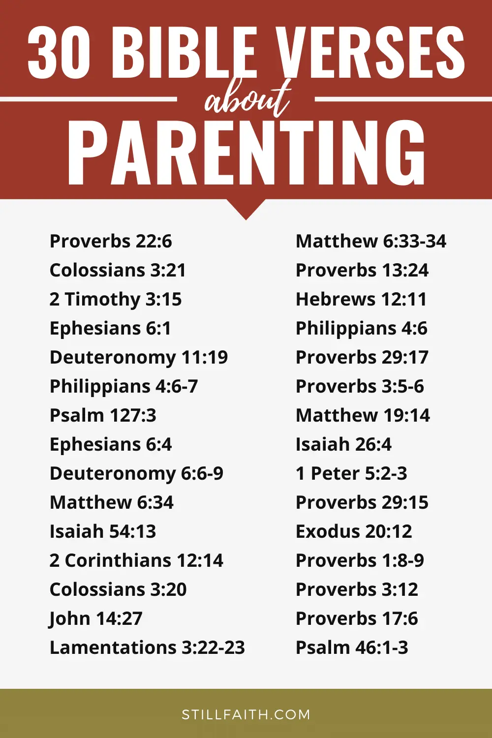 Here are 100 Bible verses about parenting, curated from both the Old and New Testaments of the Holy Bible, King James Version, arranged from most to least relevant.